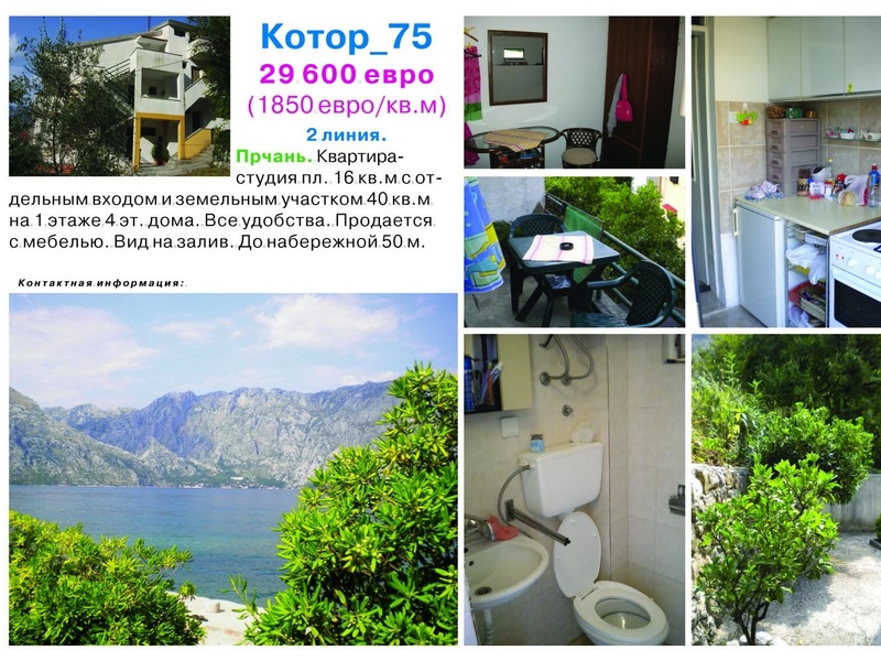 Котор. Прчань. 2 линия. Квартира-студия пл. 16 кв.м с отдельным входом и земельным участком 40 кв.м на 1 этаже 4 эт. дома. Все удобства. Продается с мебелью. Вид на залив. До набережной 50 м....