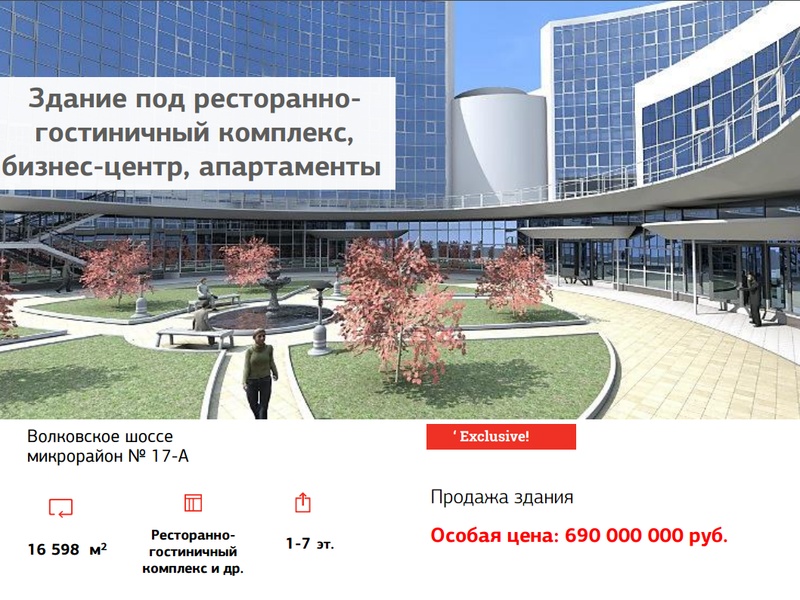Продаётся здание под ресторанно-гостиничный комплекс, бизнес-центр, апартаменты. Общая композиция комплекса представляет собой группу из нескольких корпусов, объединенных единым одноэтажным стилобатом, в котором компактно размещены входы во все корп...