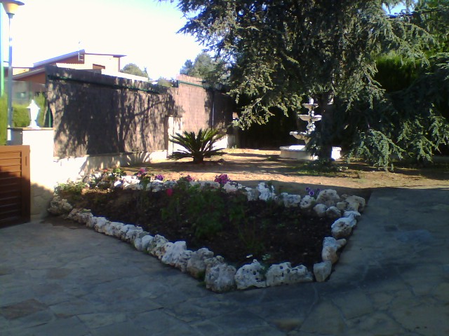 Сад с фруктовые деревья и покрыта зоной для барбекю с прямым доступом к кухне. Бассейн .