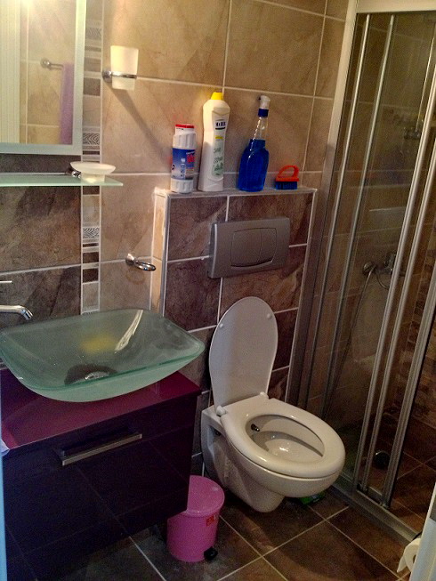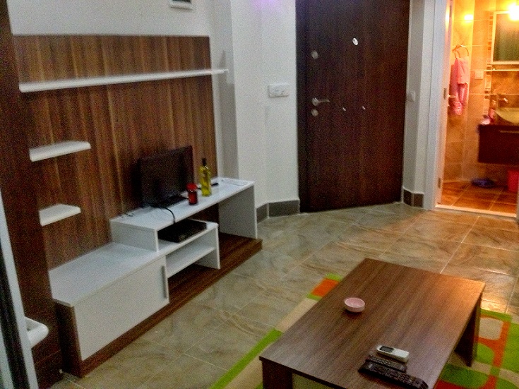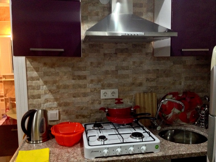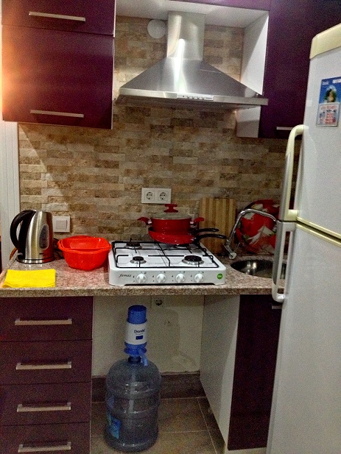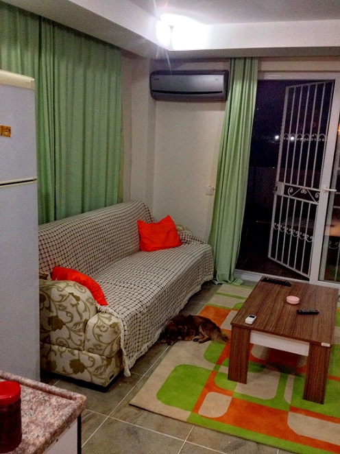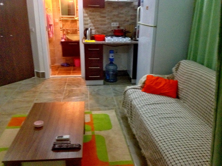 Квартира на первом этаже, кухня совмещенная с салоном, установлены кухонные шкафы. газовая печь, вытяжка, есть холодильник, вся необходимая посуда, полотенца. пастельное белье, стиральная машина, кондиционер, раскладной диван, телевизор, спутниковая система с русскими каналами, платинной шкаф, стенка- горка. В ванной комнате душ кабина. на окнах решетки, балкон с выходом в садик. Квартира рассчитана на 2 взрослых, может быть дополнительное место для ребенка.