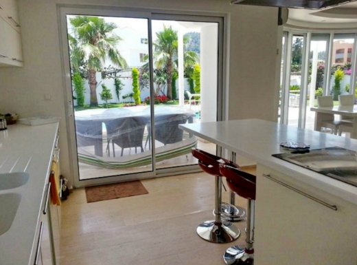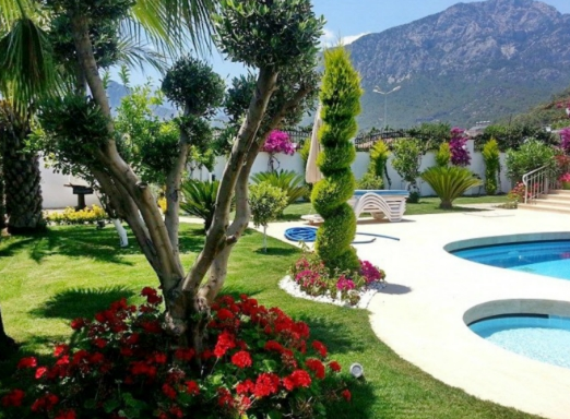 Территория виллы огорожена, есть собственный бассейн с детской секцией, ухоженный сад с экзотическими растениями и цветами, большая терраса с видом на горы перед бассейном. Вилла в 3 этажа, отдельная кухня и столовая. Вилла полностью оборудована мебелью и техникой, есть сауна, джакузи, 4 ванные комнаты с душ кабинами и сан узлами, лестничные пролеты выполнены из мрамора, на всех окнах установлены электро роль ставни датчики системы безопасности, установлена система противопожарной безопасности.