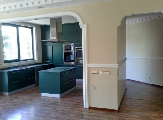 Кухня оборудована кухонным гарнитуром мраморной столешницей, укомплектованная мебелью, есть выход в гостиную комнату и в коридор. Установлено газовое отопление, противопожарная сигнализация, прямая связь с полицией.