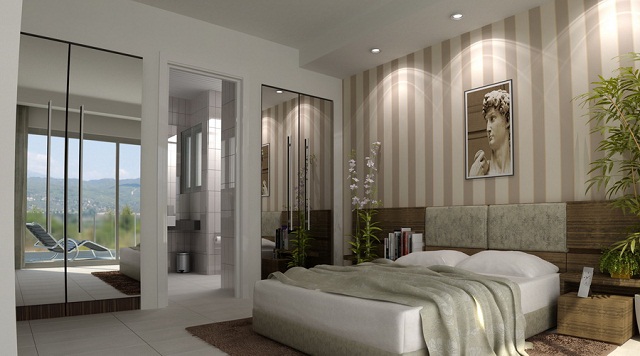 • Декоративная отделка стен в изголовье кровати в спальне для хозяев
