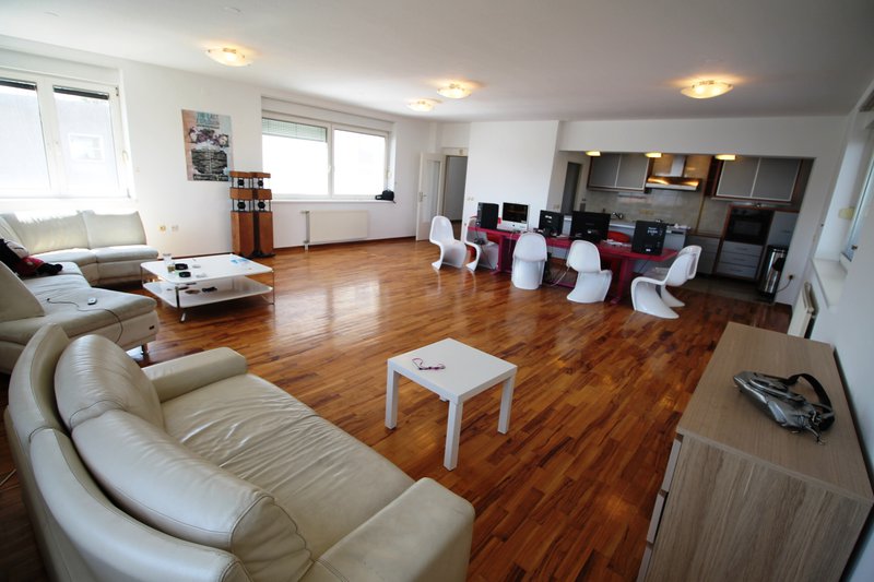 Продается большая высокостандартная квартира недалеко от центра Любляны в районе Зупанчичева яма, чистая площадь около 217 m2. Квартире принадлежит чрезвычайно большая и просторная терраса площадью около 56 м2, кладовая в подвале здания, а также собственная парковка в гараже. Квартира в дуплексном варианте находится на верхнем этаже и включает в себя: