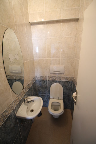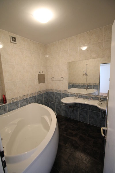 Нижний этаж: большая прихожая, коридор, ванная комната с отдельным туалетом, подсобное помещение, две большие спальни, кухня, соединенная с просторной (около 66 m2) гостиной.