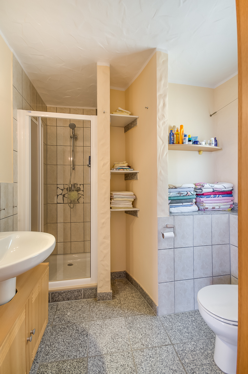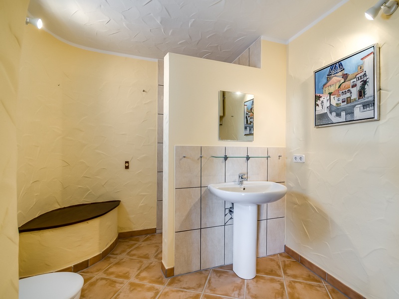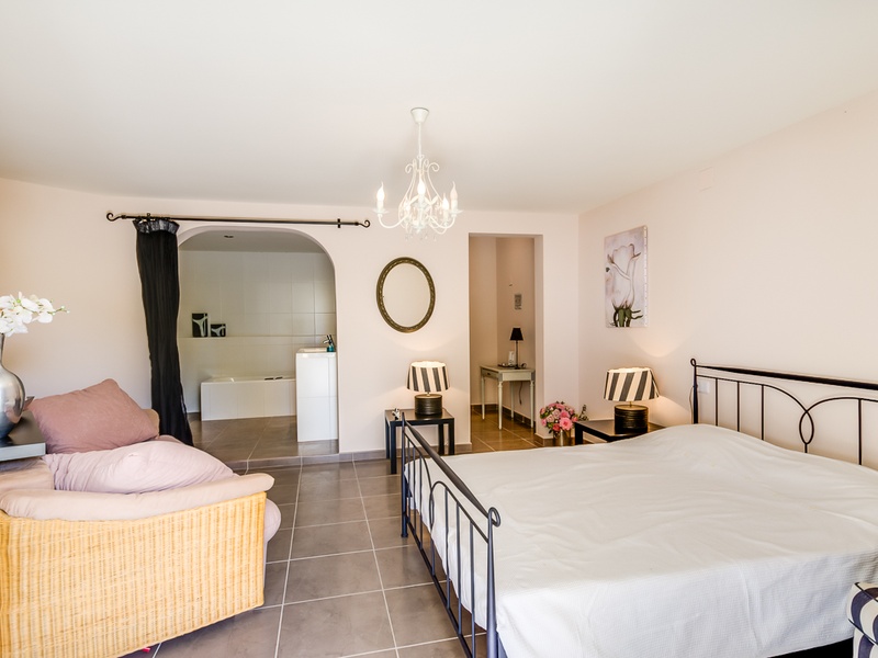 В саду двухэтажный гостевой дом, полностью автономный, с гостиной, кухней, спальней и ванной комнатой.