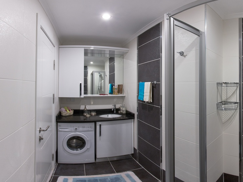 Встроенная мебель в ванных комнатах, умывальник, подвесной унитаз, душевая кабина особого дизайна