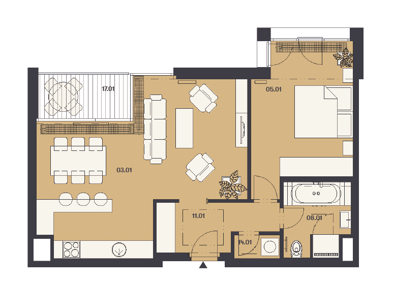 Интерьер квартиры предлагает прихожую с местом для встроенных шкафов, открытого плана гостиной комнаты, столовой и кухни, спальню и ванную комнату с туалетом. Парковочное место в гараже и подвал можно приобрести за дополнительную плату.