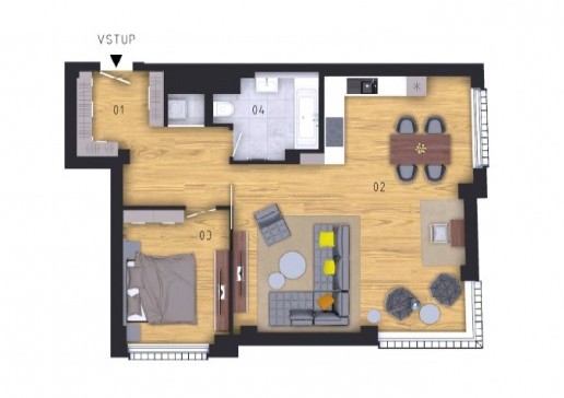 Квартира состоит из ориентированной на северо-запад гостиной с кухней, ориентированной на западную сторону спальни, ванной комнаты, технического помещения и прихожей. Квартира предлагается в состоянии white walls, т.е. до завершения окончательных поверхностей таких как полы, плитка или кухня, таким образом обеспечивая новым владельцам возможность закончить квартиру в соответствии с их потребностями и вкусами.