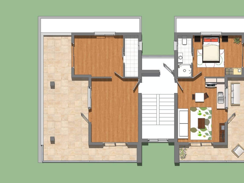 На 3 этаже дома будут расположены 2 квартиры 1+1, общей закрытой площадью 52 м2. Квартиры состоят из гостиной совмещённой с кухней, 1 спальни, совмещённого санузла и террасы площадью 25 кв.м.