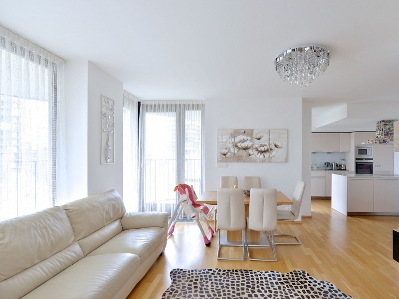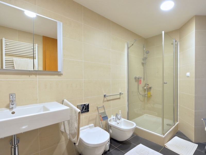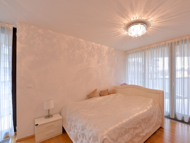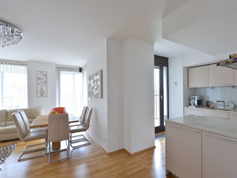 В квартире имеются деревянные полы в главной жилой части, большого формата напольная и настенная плитка в ванных комнатах, полы с подогревом, современный кухонный гарнитур и встроенные шкафы. Покупная цена включает в себя 2 парковочных места в гараже и подвал.