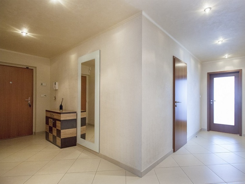 Интерьер квартиры составляет угловая гостиная с кухней, 3 спальни, 2 ванные комнаты (одна из них примыкающая к главной спальне), отдельный туалет, кладовая и центральный холл. Гостиная и две спальни имеют выход на террасу, последняя комната имеет собственную лоджию. Планировка квартиры была первоначально задумана как 5 + кухня-ниша, разделением самой большой спальни можно снова этого достичь.