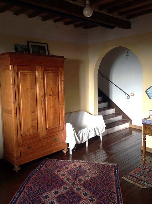 During the Middle Ages the building was used as a hospital and was transformed and renovated by the actual owner. It is located on the first floor of an antique two-storey building. It comprises 1 broad living room equipped with a fireplace, 1 kitchen, 3 bedrooms, 2 bathroom of which one serves the master bedroom , 1 study room and 1 utility room used as launderette. From the living room stairs you can reach the terrace. From the terrace you can enjoy a panoramic view over both the centre of the town and the valley, From Cortona to the Trasimeno lake. If the day is particularly clear you could even see the Majella mountains.