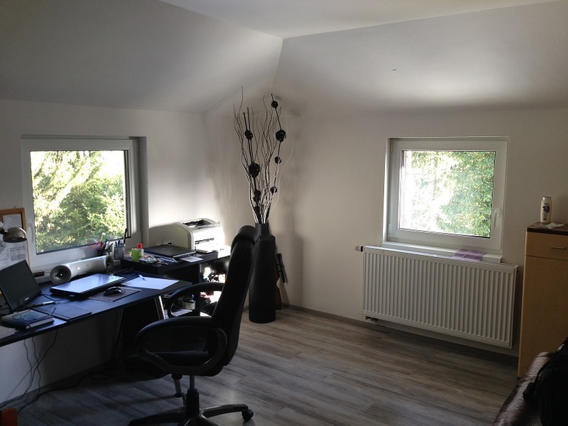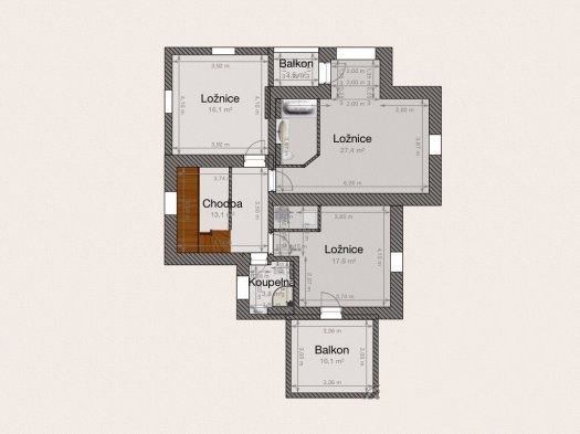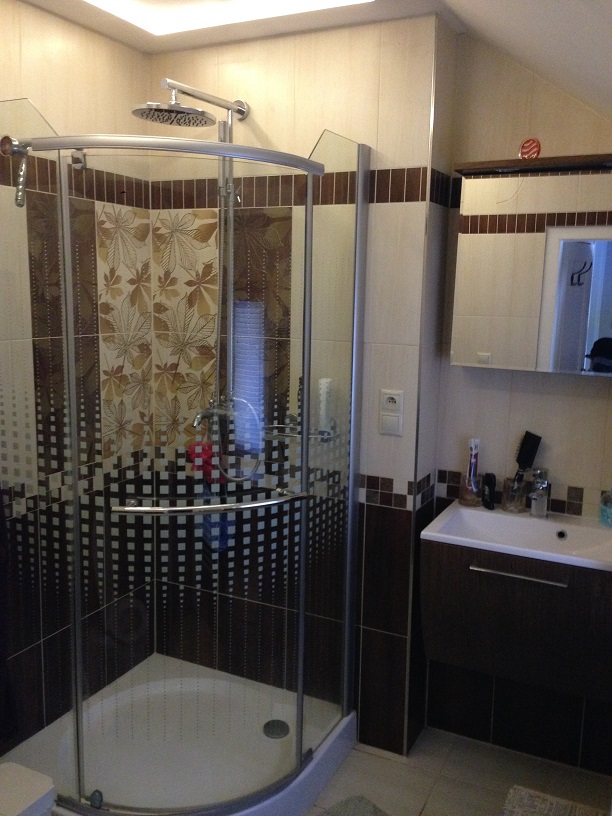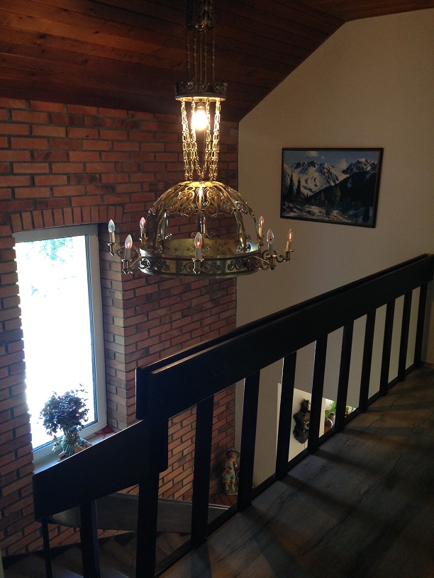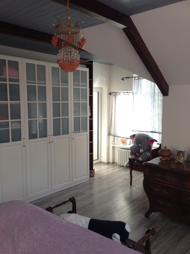 Далее, по удобной широкой лестнице поднимаемся на второй этаж, где находится санузел с душевой кабинкой и три комнаты- большая спальня 17,6 м2 с балконом 10 м2, открывающим вид на столетние сосны, меньшая комната 16 м2 и спальня 27.5 м2 с собственной ванной комнатой с джакузи и небольшим балконом 2.5 м2 с видом на лес и долину. На этом этаже оборудована прачечная, вмещающая в себя стиральную и сушильную машины и склад моющих средств и разных мелочей, необходимых в хозяйстве.