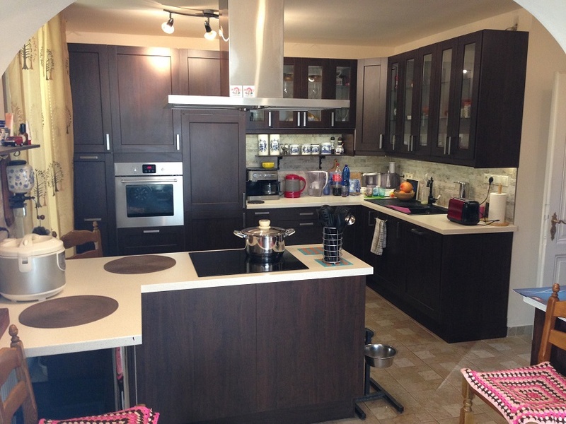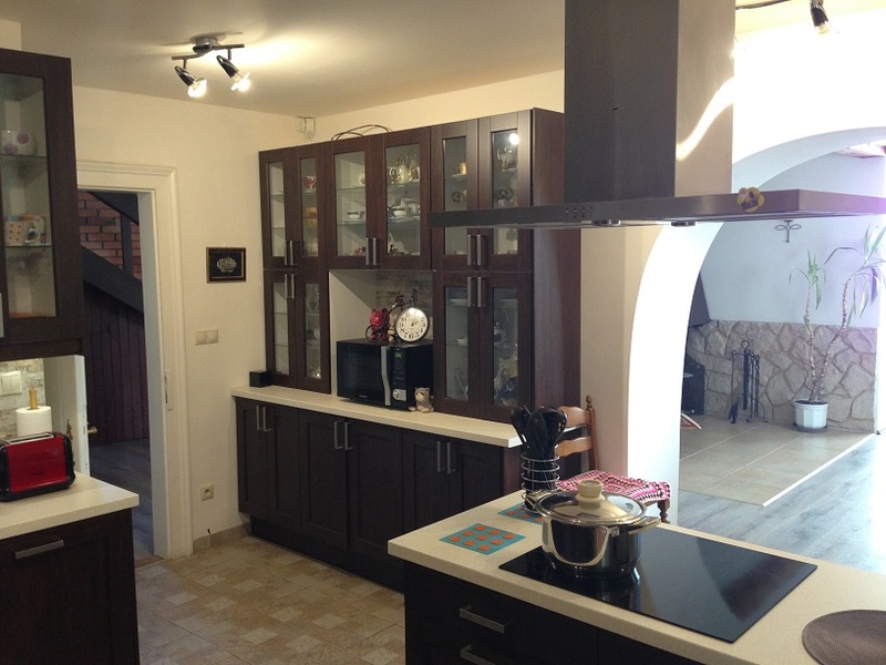 Просторная современная, полностью оборудованная кухня имеет выход на террасу, которую в тёплое время года очень удобно использовать в качестве обеденного уголка. Прямо оттуда можете попасть в сад- с этой стороны участок находится на уровне первого этажа.