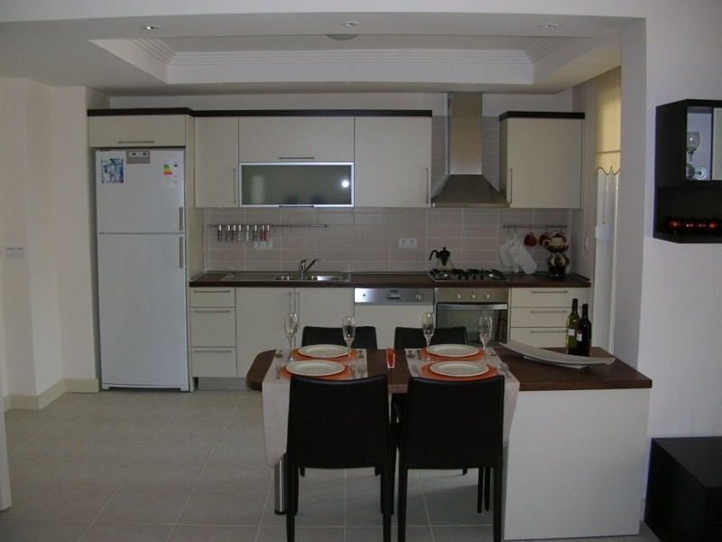 Полностью отделанная кухня со всеми пренодлежностями – кухонная печка, посудамоющая машина, холодильник, стиральная машина и кухонная мебель