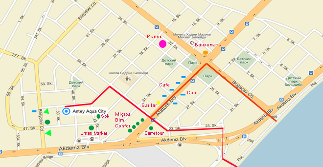 Квартира 1+1 расположена в новом комплексе Antey Aqua City, на территории которого - взрослый и детский бассейны, джакузи, сауна, хамам, фитнес центр. Территория огорожена и под видеонаблюдением. Поблизости автобусная остановка, кафе, супермаркеты, вторничный рынок.