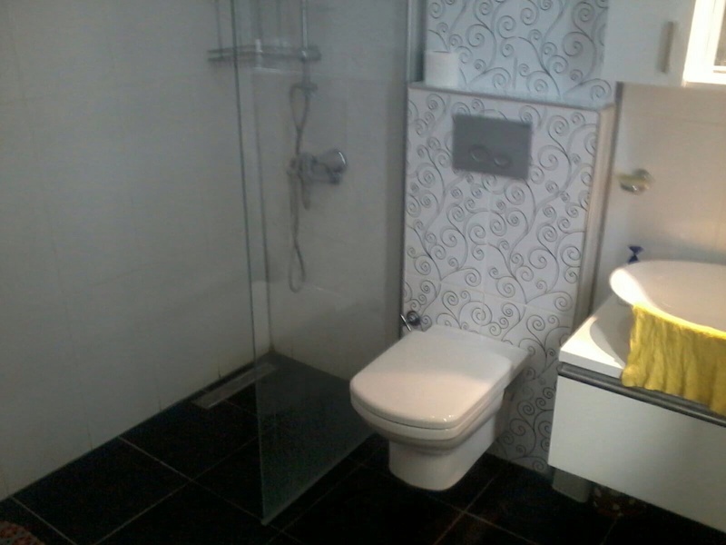 Ванная комната: душевая, зеркало – шкафчик, коврики, проточный нагреватель.