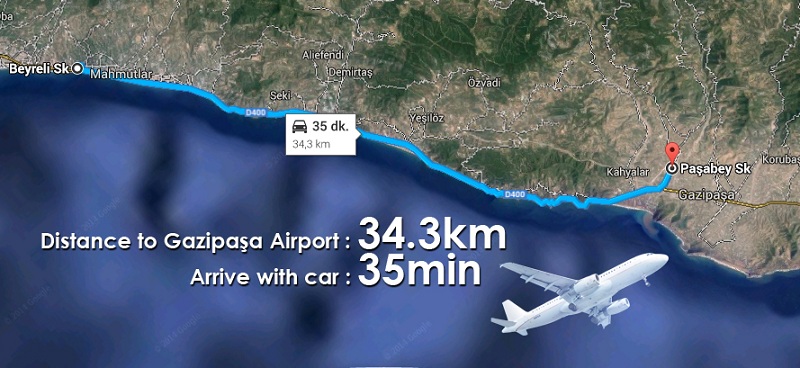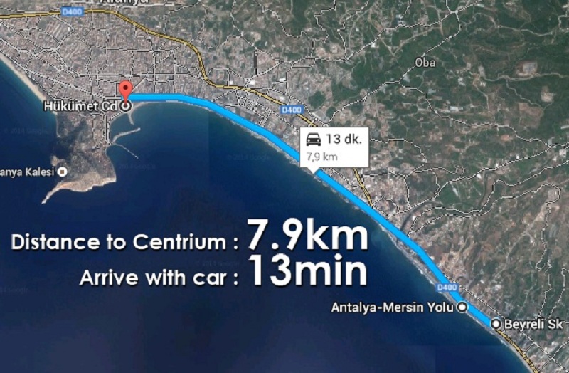 Комплекс расположен на расстоянии 7.9 км от центра Аланьи, в шаговой доступности от дома проходит главная дорога с общественным транспортом, на котором можно доехать до городских клиник, крупных торговых центров, таких как ALANYUM, МЕTRO, KOÇTAŞ и до самой главной достопримечательности Аланьи – Красной крепости. Комплекс находится всего в 150 метрах от песчаного пляжа и имеет прекрасный вид на море.