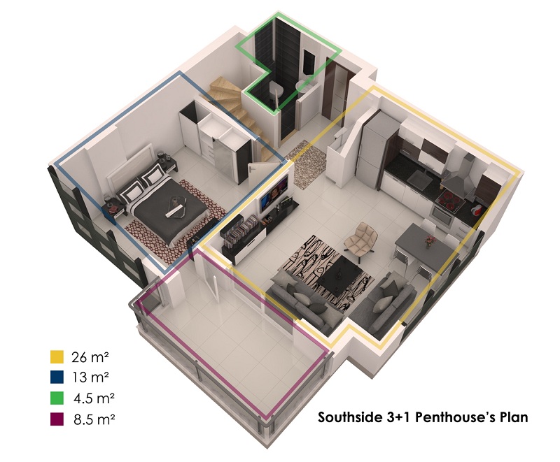 Комплекс расположен в восточной части Аланьи – районе Кестель и cостоит из одного жилого блока, который включает в себя 15 квартир с разными планировками.