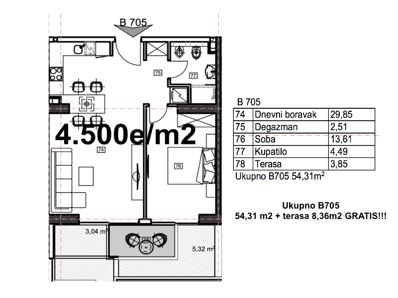 2-х комнатна квартира № B705 54.31m2 в эксклюзивном мульти-комплексе «Porto Budva» с торговым центром 8000 м2 и СПА-центром 3500 м2 с широким спектором услуг с открытым и крытым бассейнами!