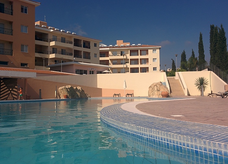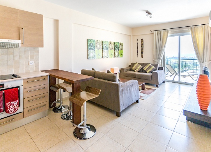 Апартаменты состоят из открытого плана кухни, просторной гостиной с выходом на большой крытый балкон с видом на море и бассейн, ванной комнаты и спальни с встроенными шкафами.