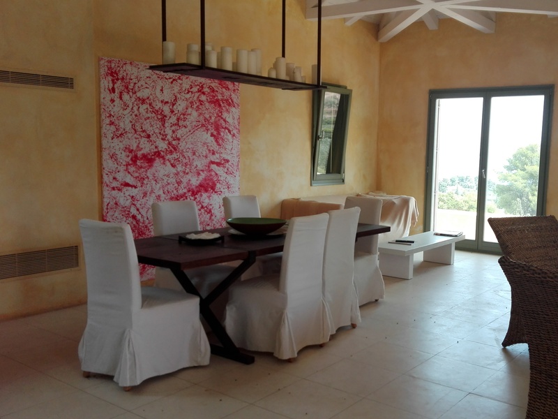 This nice villa in Porto Heli turns away from all the hustle and bustle and focuses on the beauty and serenity of nature. Uninterrupted views over the beautiful and well maintained garden, the surrounding greens and scattered pine trees and the sea in the distance is only one of the highlights of this villa. The owner of the villa is an artist who proves his talent in every detail of the villa. Every choice of colour, every piece of furniture and every facility is in harmony in the right place and produces a warm appearance.