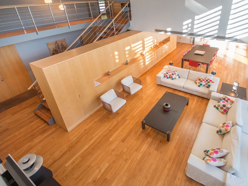 На нижнем этаже имеется большой просторная гостинная с потолками с двойной высотой , разделенная на столовую зону и зону отдыха. Площадь гостинной более 100м2. На этом же этаже имеется спальня типа сьют с ванной, гардеробом и с выходом на террассу.