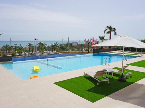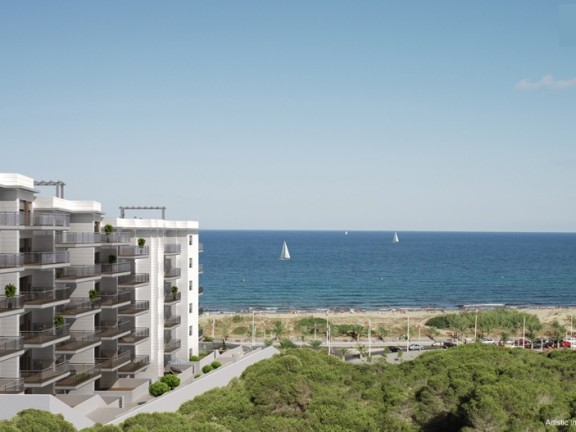 Продается квартира на первой линии средиземного моря на побережье Коста Бланка (юг), полоса средиземноморского побережья в Испании, провинция Аликанте, автономное сообщество Валенсия. Зона туризма и отдыха. Квартира была построена в 2015 году, имеет 3 спальни, 2 ванные комнаты. Жилая площадь составляет 57 квадратных метров , общая площадь 67 квадратных метров, терраса 7 квадратных метров, парковка. Есть лифт, терраса с видом на пляж, кондиционер, бассейн, тренажерный зал, теннисный корт, сад с видом на море. Корпус состоит из различных типов моделей, квартиры с садом, апартаменты с террасой или апартаменты с солярием. Они имеют 2-3 спальни и 2 ванные комнаты, полностью оборудованные индукционной плитой и вытяжкой, большой гостиной, которая дает доступ к крытой и открытой террасе. Самые требовательные люди будут удовлетворены в этом комплексе с прекрасным видом на Средиземное море; легкий доступ к магазинам, ресторанам и развлекательным центрам.