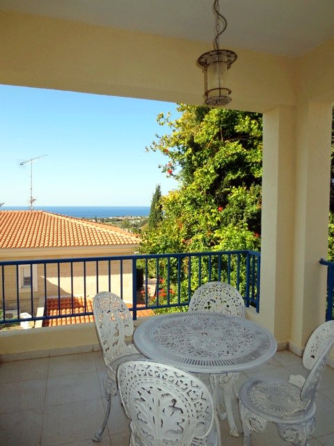 С террасы дома открывается отличный вид на море, город и зеленые холмы.