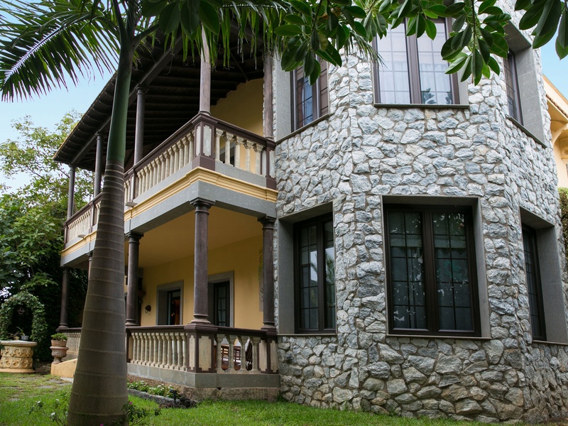 При входе в собственность через большие армированные деревянные ворота, мы видим красивый зеленый сад и дом в окружении пальм и деревьев, с внушительной каменной башней, сделанной и обработанной в технике под серебро и привезенное прямо из Италии.