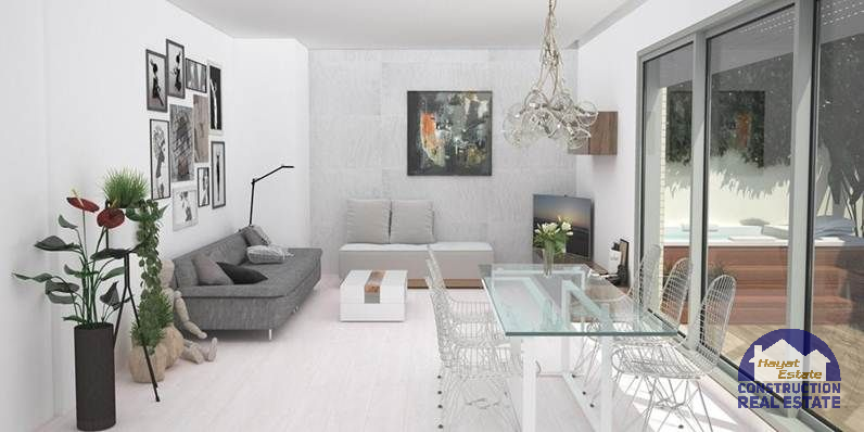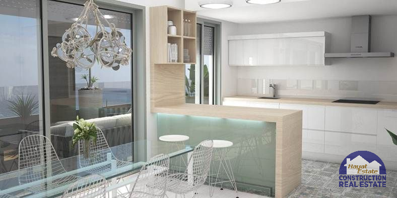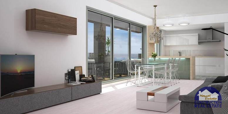 Квартиры с 2 или 3 спальнями, большая гостиная с выходом на террасу с панорамным видом, встроенные шкафы во всех спальнях, 2 ванные комнаты, алюминиевые окна. Стекло клималит, моторизованные жалюзи в гостиной и главной спальне, пол с подогревом по всей квартире, гладкие стены. Меблированная кухня белого цвета (глянец).