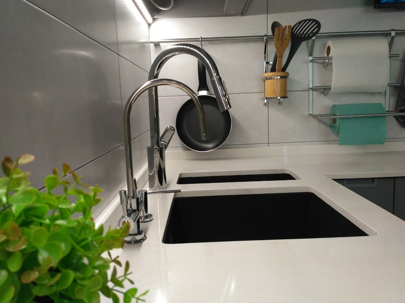 - Кухня с выкрашенными фасадами (никакой ламинации), столешница из кварцевого камня, мойки из камня