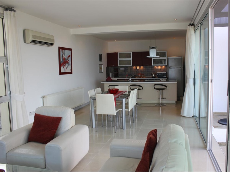 Кухня открытой планировки современная, и спроектирована по высоким стандартам. На втором этаже расположены две светлые спальни с собственными ванными комнатами и выходом на террасу, из которой простирается необъятный вид на бассейн и сад. В непосредственной близости от местных удобств, небольшого рынка, банка и главной дороги в центр Кирении.