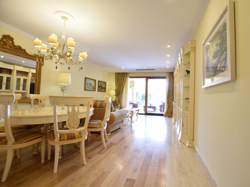 Квартира на первом этаже, с большой террасой и частным садом, откуда можно выйти в общий сад и к бассейну. Общая площадь - 170 м2, жилая - 120 м2, терраса - 50 м2. Квартира состоит из 2 спален, 2 ванных комнат, гостиной с обеденной зоной и кухни. Недавно был сделан дорогой ремонт, установлена новая кухня и новые двери. Во всей квартире установлена система "Тёплый пол". Полы деревянные. Окна выходят на юг, квартира светлая и солнечная и идеально подходит для семьи с детьми. В цену также включена кладовая, которая находится в гараже, и 1 парковочное место в подземном гараже.