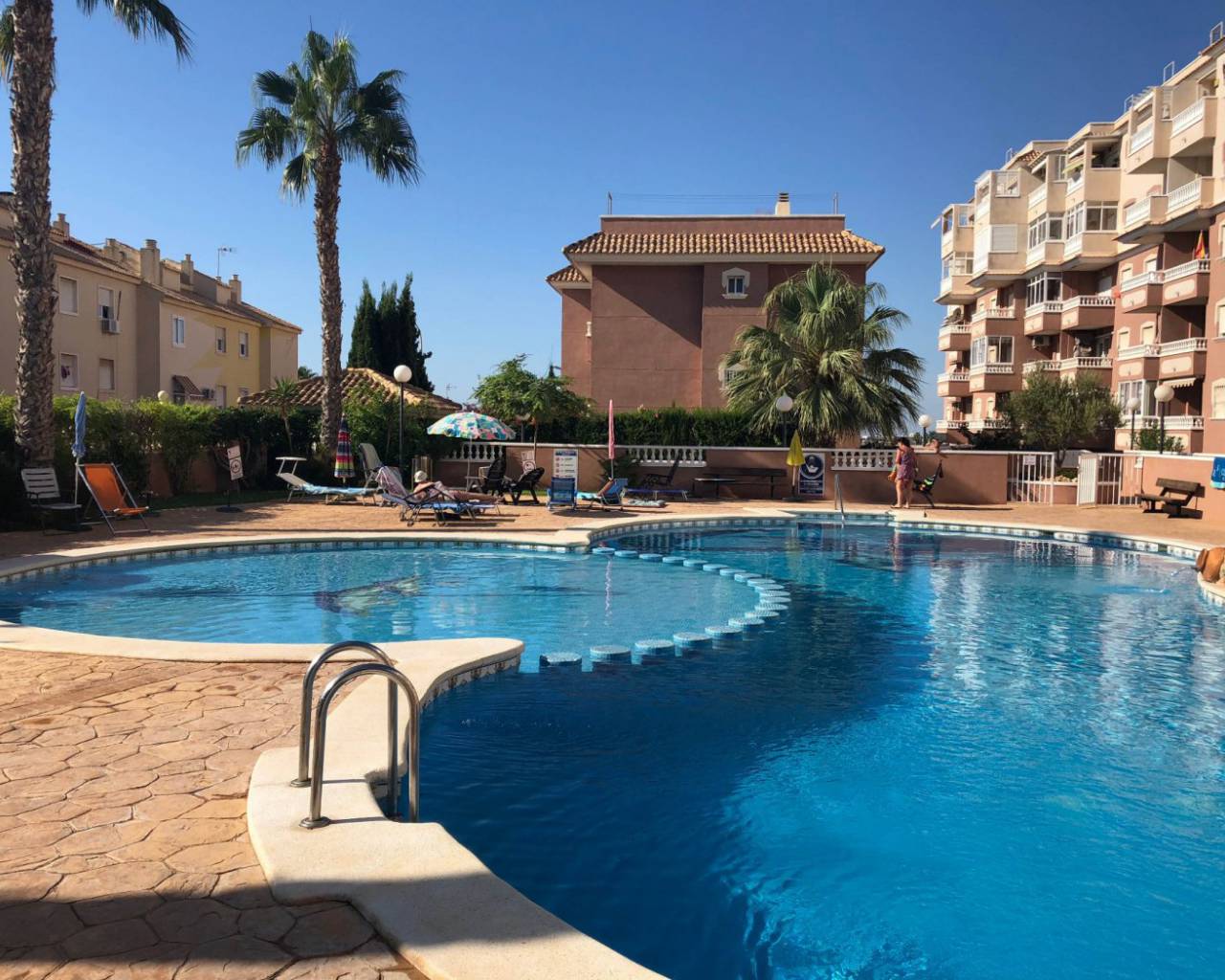 Бунгало на нижнем этаже со своим двориком расположено всего навсего в 10 минутах ходьбы от пляжа. Помимо этого на территории комплекса имеется большой плавательный бассейн с комфортной зоной для отдыха, где можно наслаждаться великолепным средиземноморским климатом и теплым солнцем.