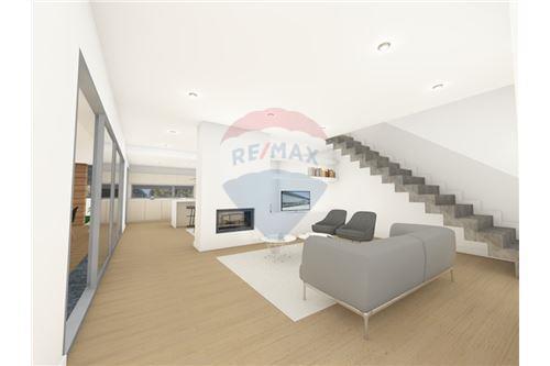 На первом этаже В доме есть прихожая с гардеробом, гостиная с двухсторонним камином, кухня открытого плана, полностью оборудованная встроенным BOSCH, туалетом и офисом.