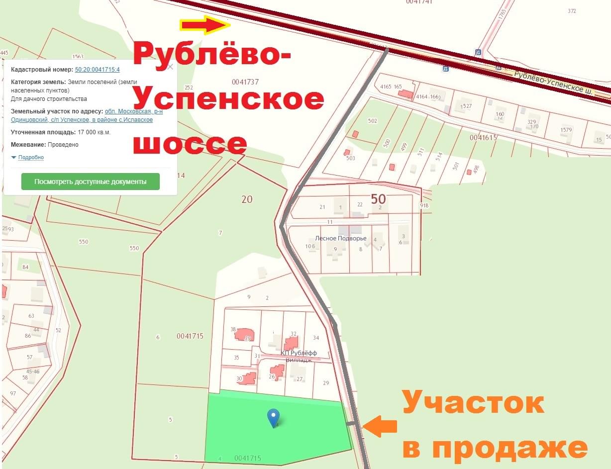 500 метров от Рублево-Успенского шоссе по общей асфальтированной охраняемой дороге с КПП, проходящей рядом с участком.