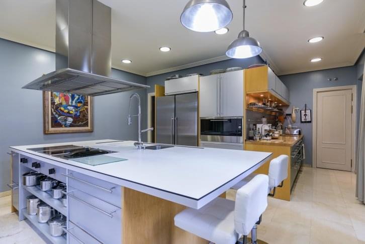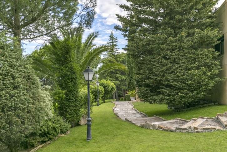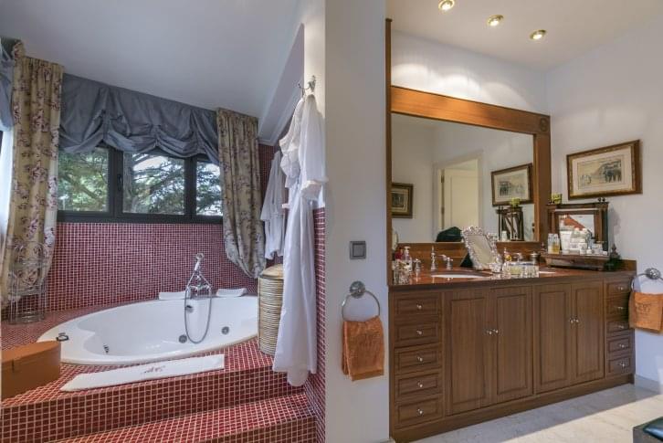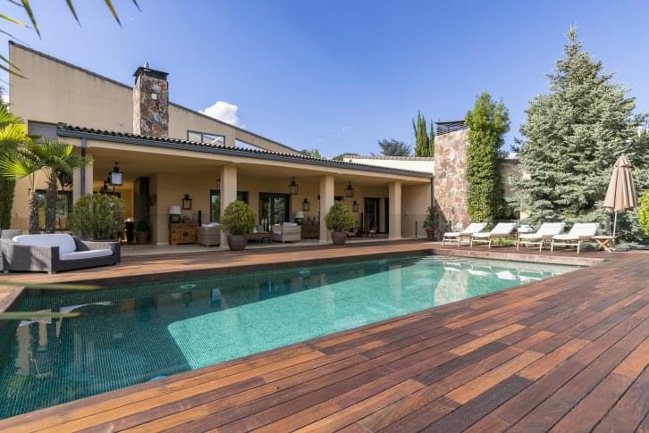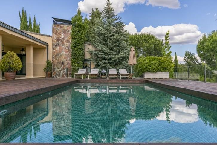 Так же на территории участка расположен великолепный бассейн с подогревом, отдельная раздевалка и полностью оборудованная ванная комната. Бассейн ограждён стеклянным щитом, с видом на парк Сьерра-де-Гвадаррама.