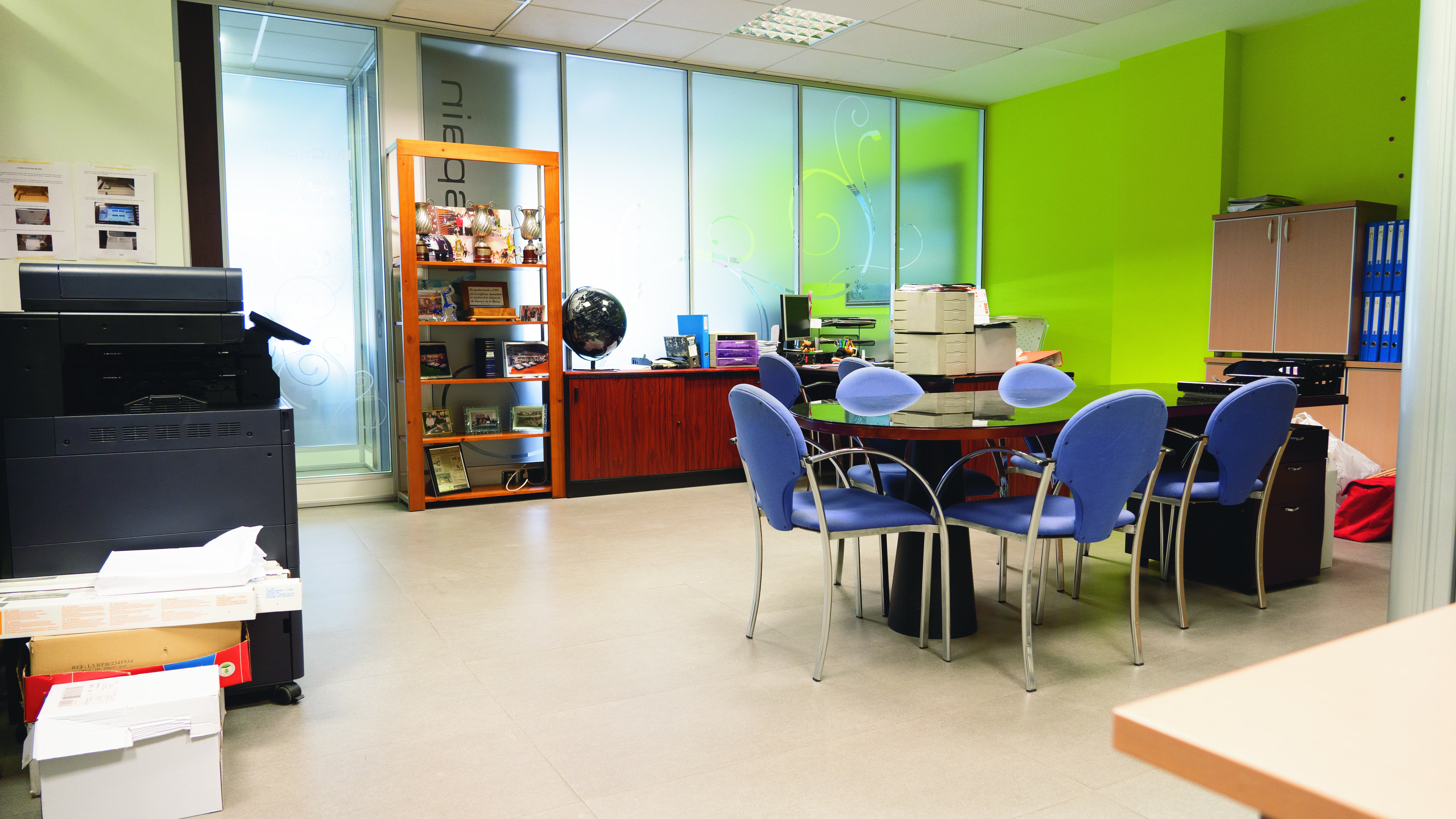Конструкция состоит из трёх этажей, разделённая на зоны: склад,офисы,зал для конференций, зал для выставки продукции (showroom),имеется в распоряжении лифт. В помещение задействовано противопожарная система по всей территории офисов и showroom + система WIFI.