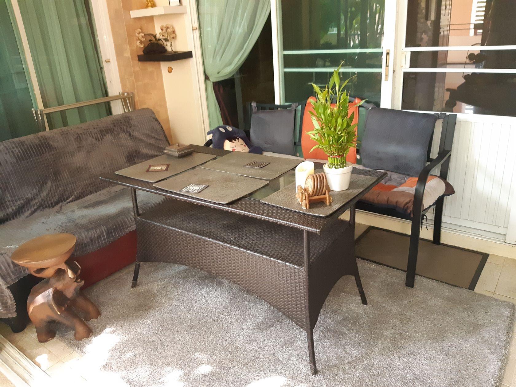 Апартаменты состоят из двух больших спален и двух санузлов. Спальни оснащены кондиционерами, телевизорами, удобными и вместительными шкафами, двуспальными кроватями, прикроватными тумбами и светильниками и небольшими диванами для отдыха.. Интерьер не перегружен лишними деталями, есть картины, выдержанные в одном стиле. Гостиная совмещена с полностью оборудованной кухней. В гостиной имеется телевизор, большой диван, журнальный столик. Гостиная оборудована двумя кондиционерами. Меблирована в тайском стиле. Есть выход на просторную террасу. Кухня полностью оборудована (СВЧ печь, холодильник, электрический чайник, электрическая плита, кухонное оборудование и пр.). Просторная терраса является зоной отдыха. Застеклена (раздвижные панорамные двери) со стороны сада и гостиной. На террасе имеются диван, декоративный шкаф, стол, садовые кресла. На территории комплекса имеется тренажерный зал с современным оборудованием и видом на внутренний дворик с красивым садом. Также на участке расположен общий открытый пейзажный бассейн с шезлонгами и зоной для загара. Имеется небольшой теннисный корт и кафе. В апартаментах есть Wi-Fi и удобная парковка.