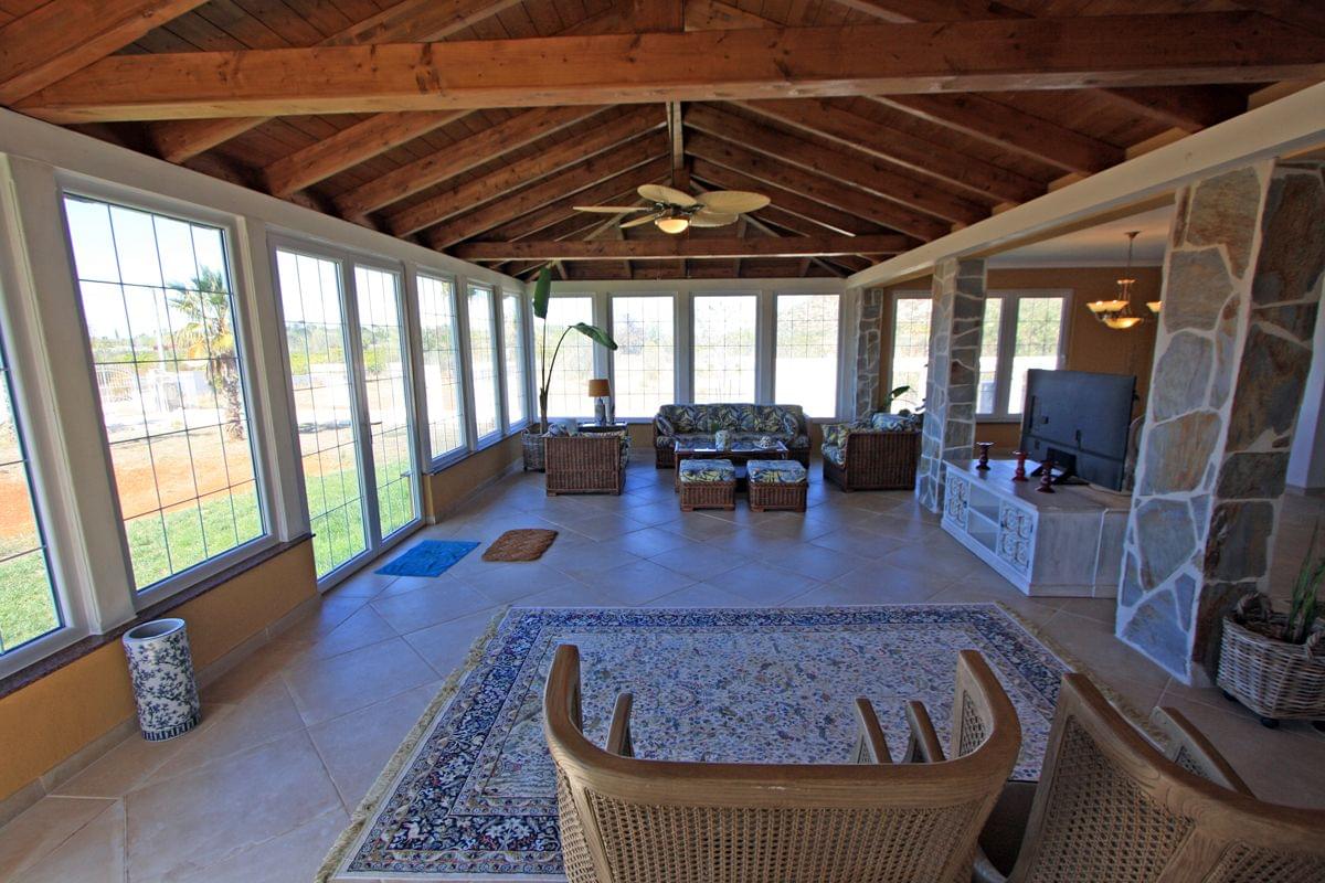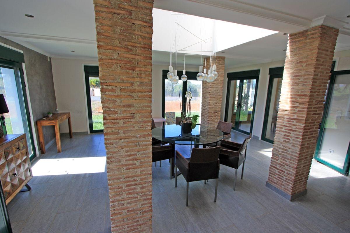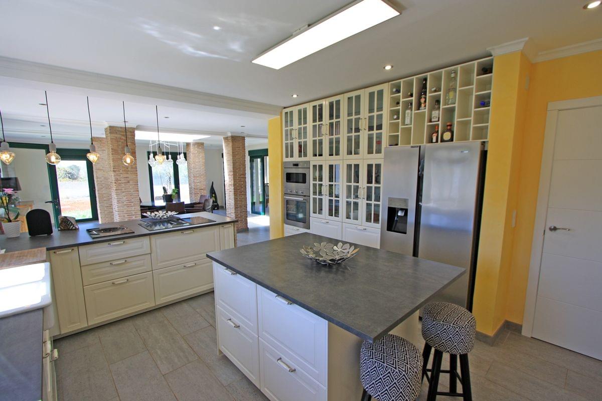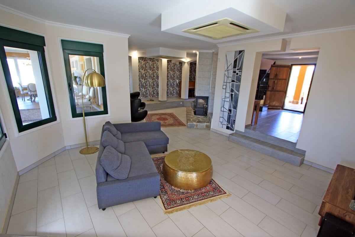 This impressive villa - manor house is for sale in the municipality of Pedreguer, which is actually much closer to La Jara - Dénia. Rustic property of more than 8,000 m2 fully fenced with a house on two floors with the following distribution: entrance hall next to the first living room with fireplace, 1 guest toilet, open kitchen with pantry and laundry room connected to the dining room with dome - skylight above , exit to a large fully glazed terrace where another dining room and another living room have been created. An internal marble staircase leads to the master bedroom with integrated hydromassage bathroom, an internal balcony with dressing room and access to a large open terrace with panoramic mountain views. On the same floor there are three more bedrooms, all with wardrobes and access to the above-mentioned terrace, as well as another complete bathroom with shower and hydromassage bathtub. Please note that on the ground floor, in the east and west wings, there are 2 independent studios, each with 1 bedroom, 1 bathroom and 1 independent kitchen. Equipped with the best materials: clay floor, gres, marble, wood, aluminum windows with double glass and electric blinds, individual air conditioning hot / cold, fully equipped kitchens, etc. The property has large green areas and a covered carport for several vehicles and is on the Facing 4 directions, without shadow problems, always sunny and with the peace and quiet of a life in the country without noise. Agricultural area just 7 km from Dénia and its beaches or 5 km from the El Portal de La Marina shopping center next to the A-7 motorway.