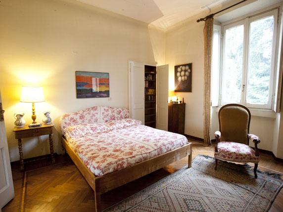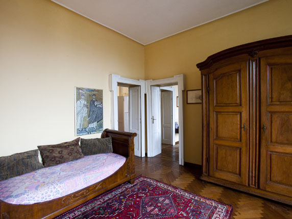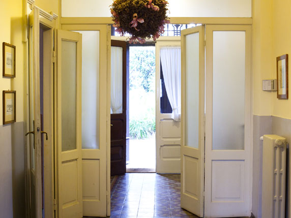 The villa's main residence is distributed on two floors; many of the main ground floor rooms benefit from direct access to the garden or to the spacious terrace on the southwest side of the house. The ground floor also has a spacious entrance hall, which connects the large living room with stained glass doors, the kitchen and two additional rooms, and a bathroom. The first floor has all the necessary fixtures and facilities to create a separate apartment with independent entrance; or if used as the sleeping quarters, it has sufficient space to create a private dressing room and en-suite bathroom to go with each bedroom. On the lower ground-floor there are various unfinished rooms, which could be made into storage rooms or a wellness area. The area's size and high ceilings would make it possible to create an indoor swimming pool, enclosed by windows, which look outs over the private garden.