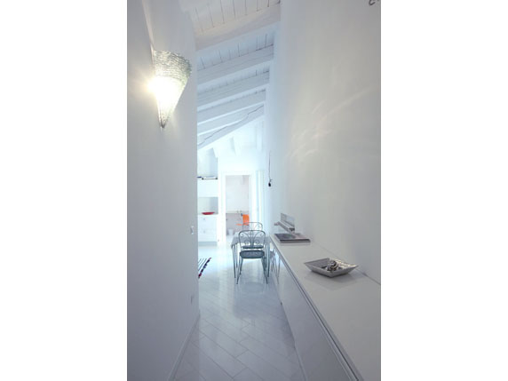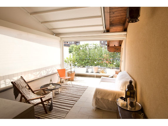 The apartment is composed of: a hallway, a multifunctional room which serves as a bedroom and living room with open kitchen, a powder room with built-in closets, bathroom and a wonderful 18 sqm terrace, which is fitted with a screen system designed by Corradi, which encloses the terrace in order to give it a unique privacy and allow it to be used during the entire year.
