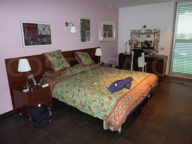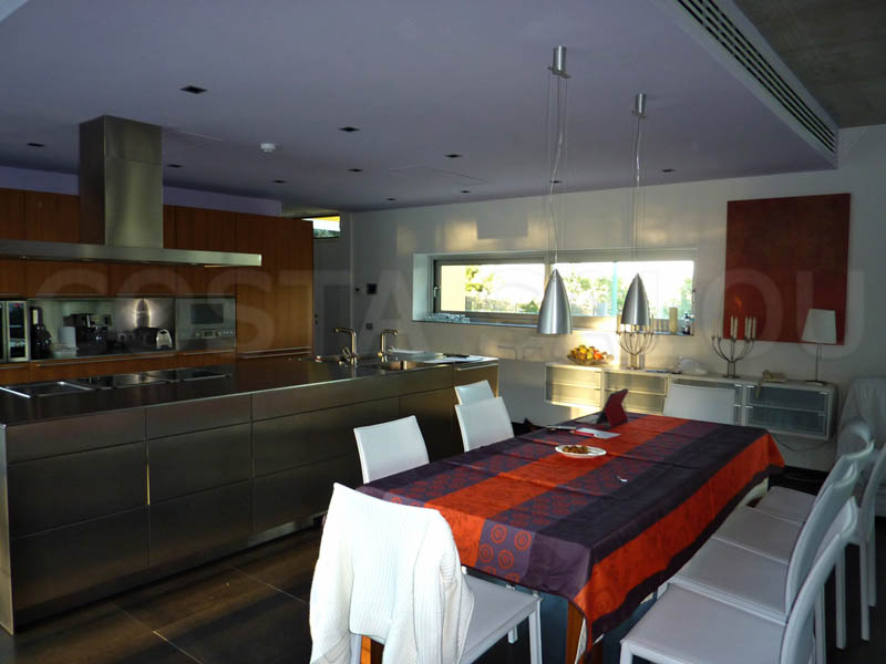 Здание 2-этажное, салон – столовая площадью 60 кв.м, всего 5 спален, 2 из которых объединены с ванными комнатами с гидромассажным душем (типа «сюит»), есть ещё 3 спальни, для которых предусмотрена ванная комната с гидромассажным душем и также ванная комната с видом на бассейн и на сад, террасы общей площадью около 200кв.м. Кроме того в цокольном этаже имеются отдельные апартаменты с ванной комнатой в цокольном этаже для прислуги. Имеется бассейн, сад, внутренний дворик, гараж на 2-3 автомобиля. Установлено спутниковое телевидение, Wi-Fi, система кондиционирования «тепло – холод», камин. Дом полностью меблирован, оборудован бытовой техникой, оснащён всеми необходимыми принадлежностями для приятного отдыха, есть охранная сигнализация.