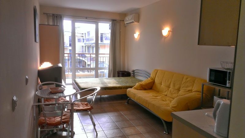 Площадь студии - 44 кв.м. Жилье представляет собой большую комнату с обособленными спальной, кухонной и гостиной зонами, также есть ванная комната с туалетом и прихожая. В квартире установлен кондиционер, металлические входные двери, внутренние - МДФ, напольное покрытие - керамогранит на кухне и в прихожей, ламинат - в гостиной. Предлагается меблированной. Квартира располагается на 5 этаже, благодаря чему у владельца будет возможность любоваться потрясающим морским пейзажем с террасы и нежиться в лучах солнца в собственном солярии.