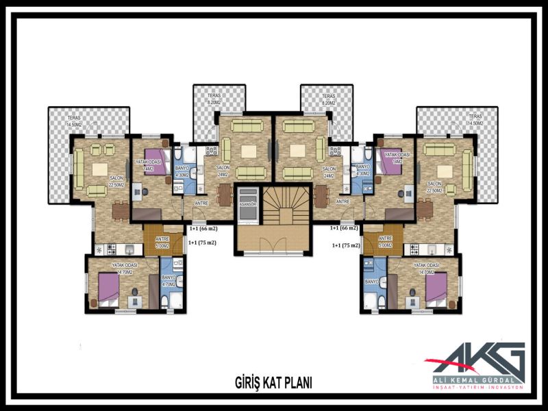 • Квартиры 1+1, 2+1 на средних этажах и квартиры дуплекс 2+1, 3+1 на верхнем этаже.