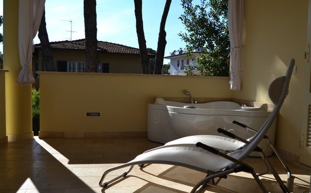 Двухэтажная вилла, расположена в Форте-дей-Марми (Тоскана),  в 250 м от моря. Общая площадь виллы 160 кв.м. На первом этаже располагаются гостиная, кухня и спальная комната с ванной и санузлом. На втором этаже: две спальные комнаты, ванная комната и санузел. Также имеются две просторных террасы, на одной из которых установлена джакузи.  Вилла недавно построена с использованием современных материалов, выполнена качественная отделка. На территорию уютного частного сада можно попасть напрямую из гостиной. Также на территории есть два парковочных места. Вилла предлагается к продаже полностью меблированной. Ближайший аэропорт  Galileo Galilei расположен в 44 км, в городе Пиза.